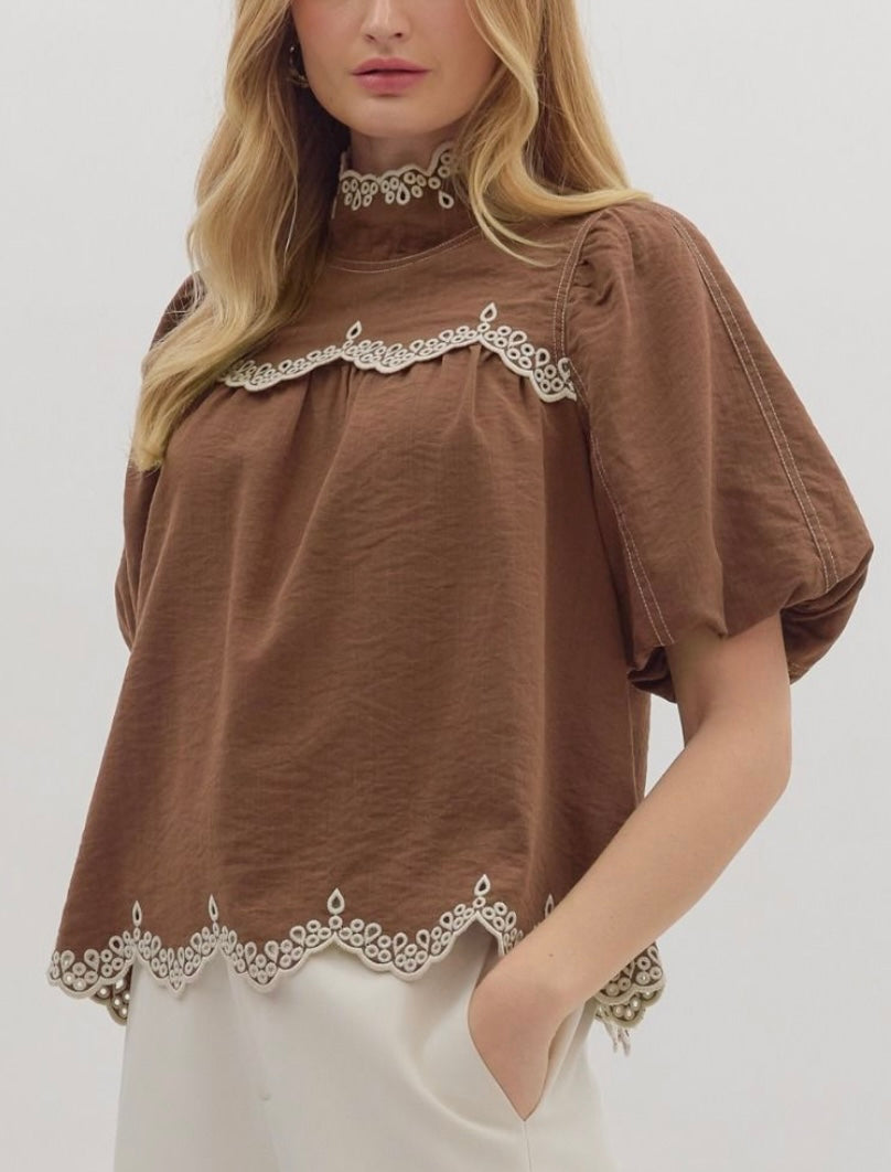 - Espresso puff sleeve top featuring contrast scallop embroidered trim at neck, chest and hem