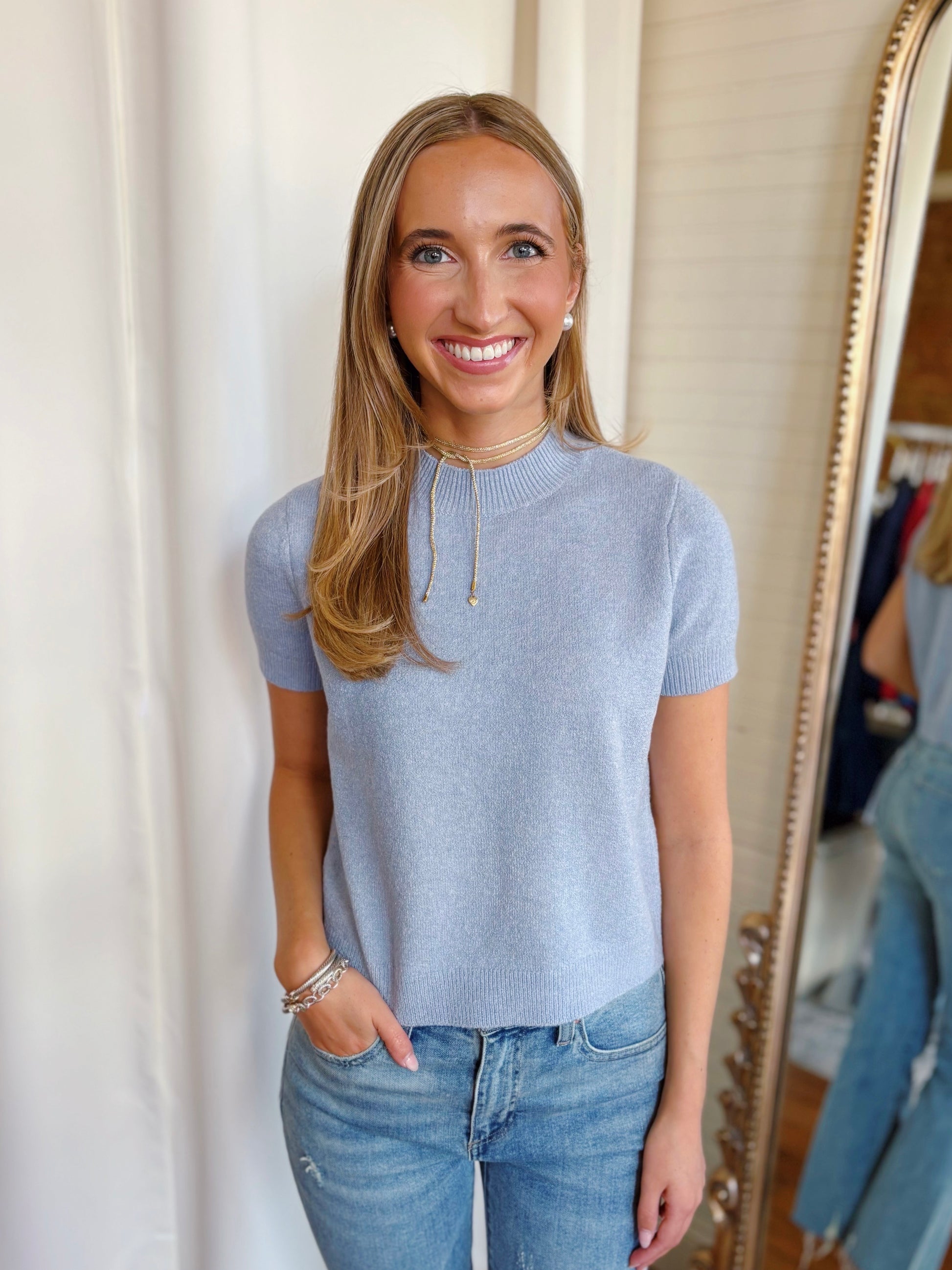 The Vhari Short Sleeve Sweater Top is an easy knit with a little edge. Made from cozy Vhari yarn, it features a ribbed mock neckline and relaxed tee silhouette. Perfect for when you want to keep things casual but still pulled together.