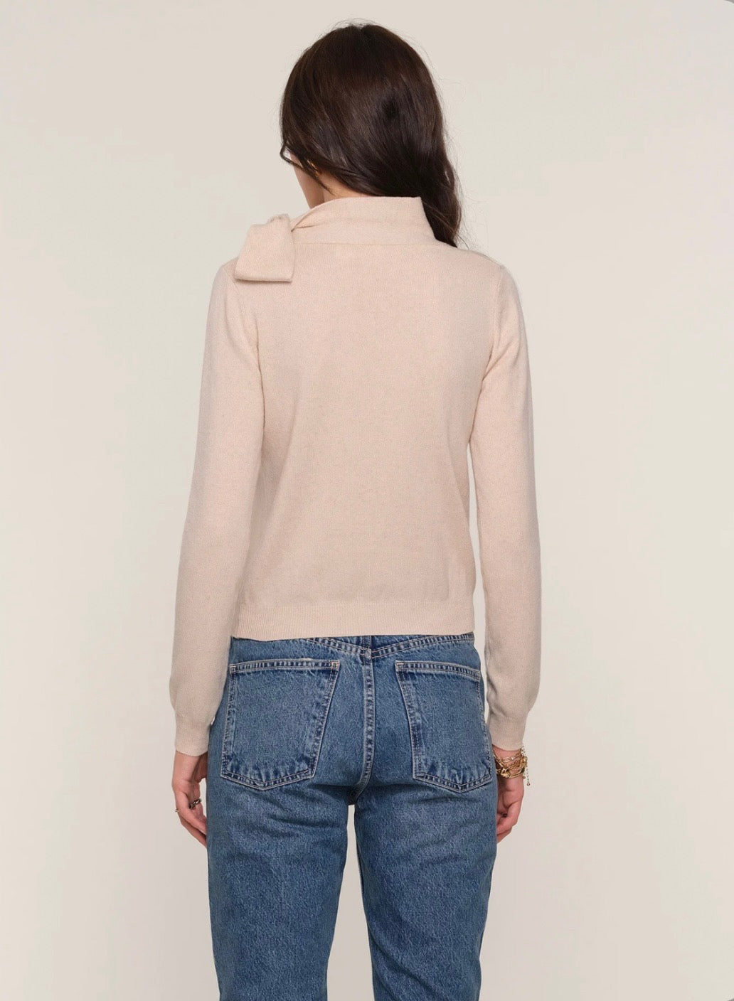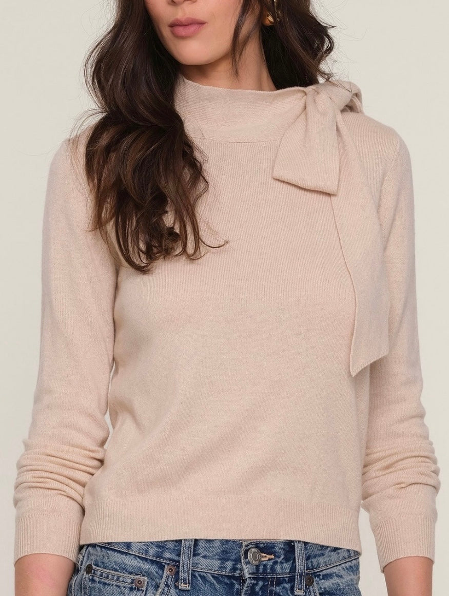 The Lissa Sweater is a relaxed fit sweater. Made from a cashmere blend it features a mock neck that ties into a bow.