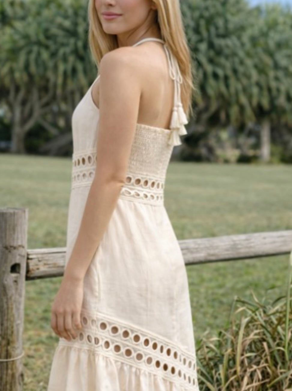 - Delicate cutwork lace trimmed halter maxi dress